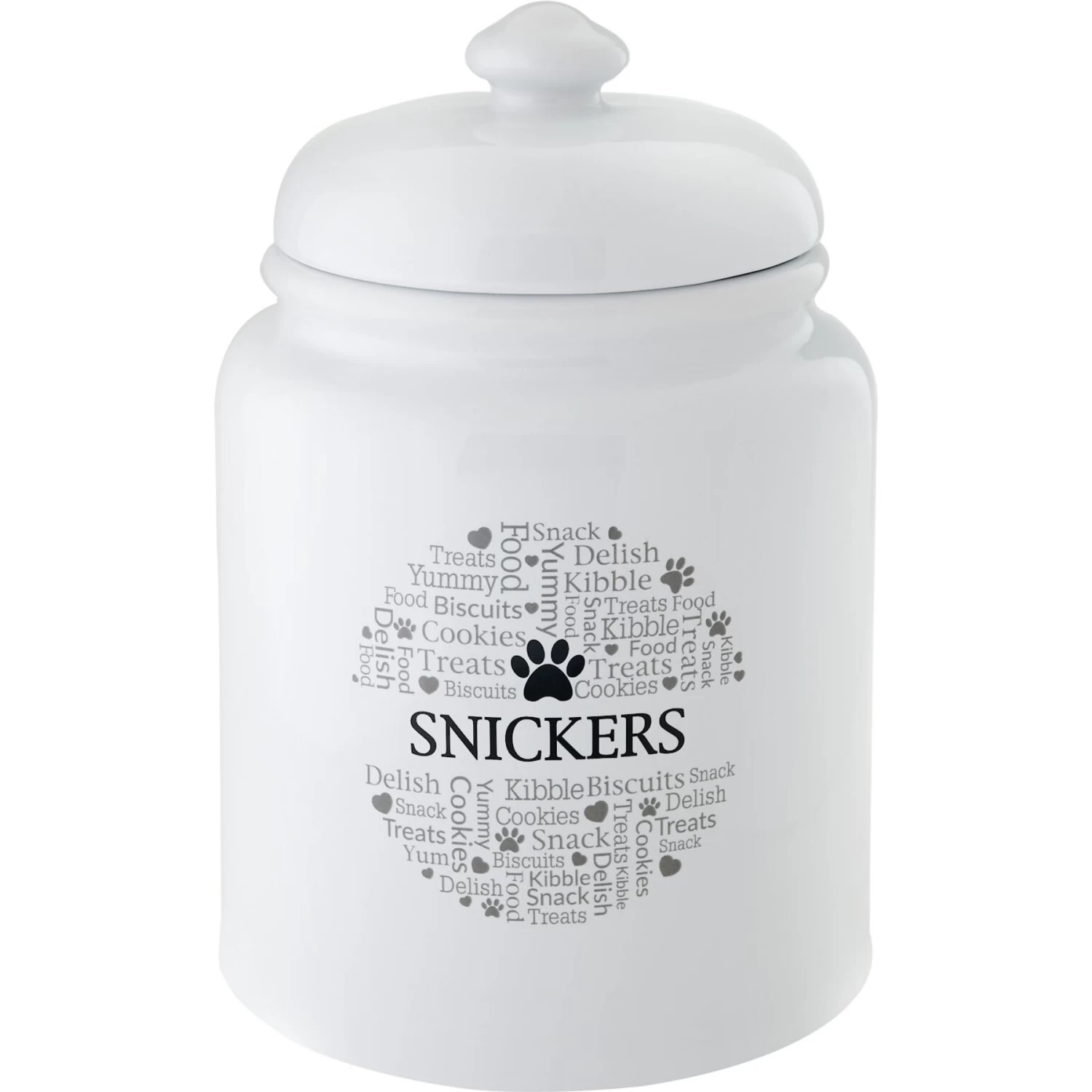 - Clean, white ceramic treat jar with black graphics on the side.
