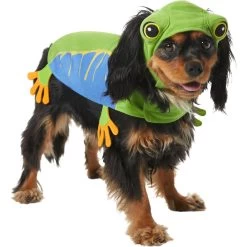 - Features a green body with blue stripes and a face headpiece that look just like a cute frog. You won’t be able to tell the difference between your pet and the real thing.