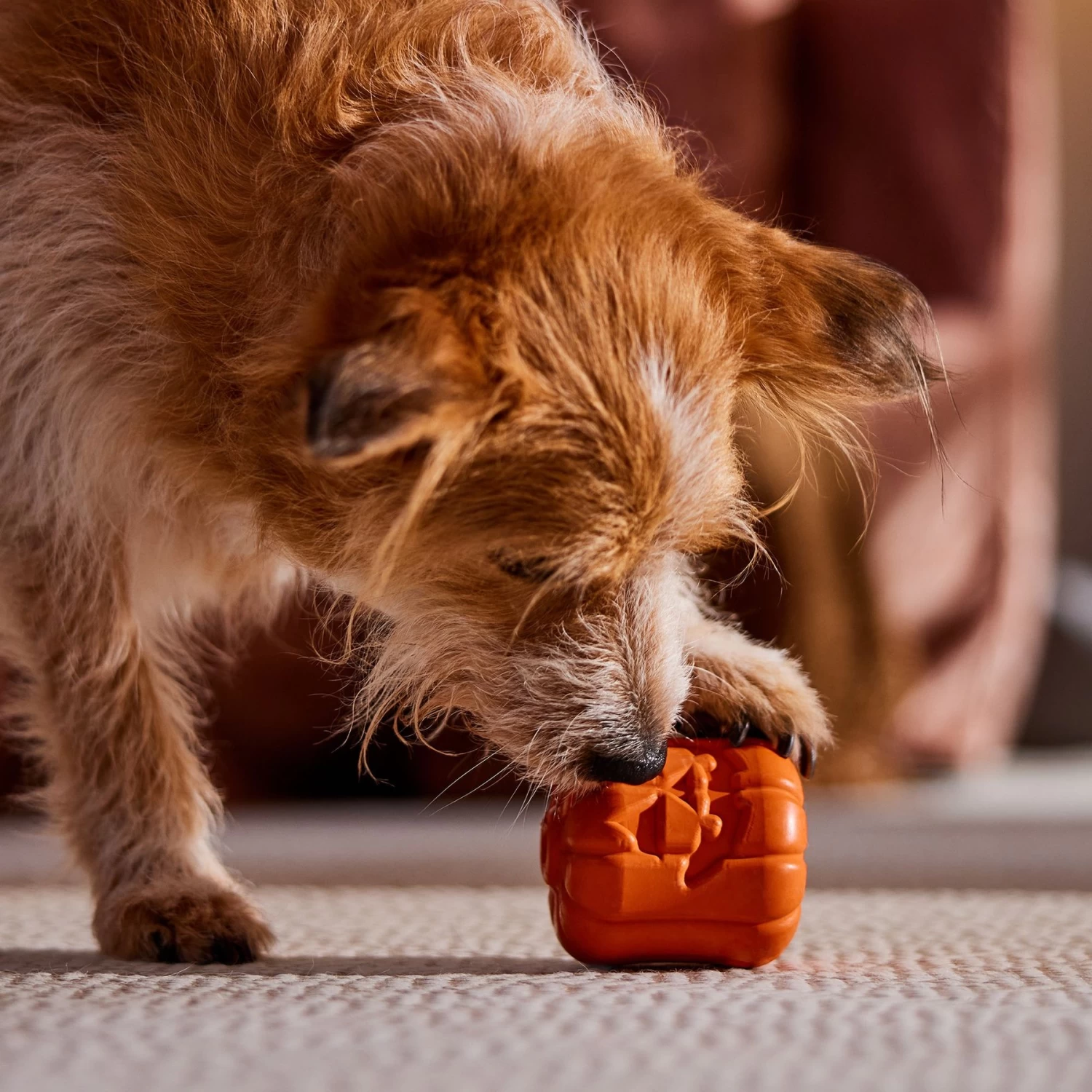 - Halloween inspired, natural rubber, fillable toy provides a mentally stimulating challenge for your medium to large size dog.