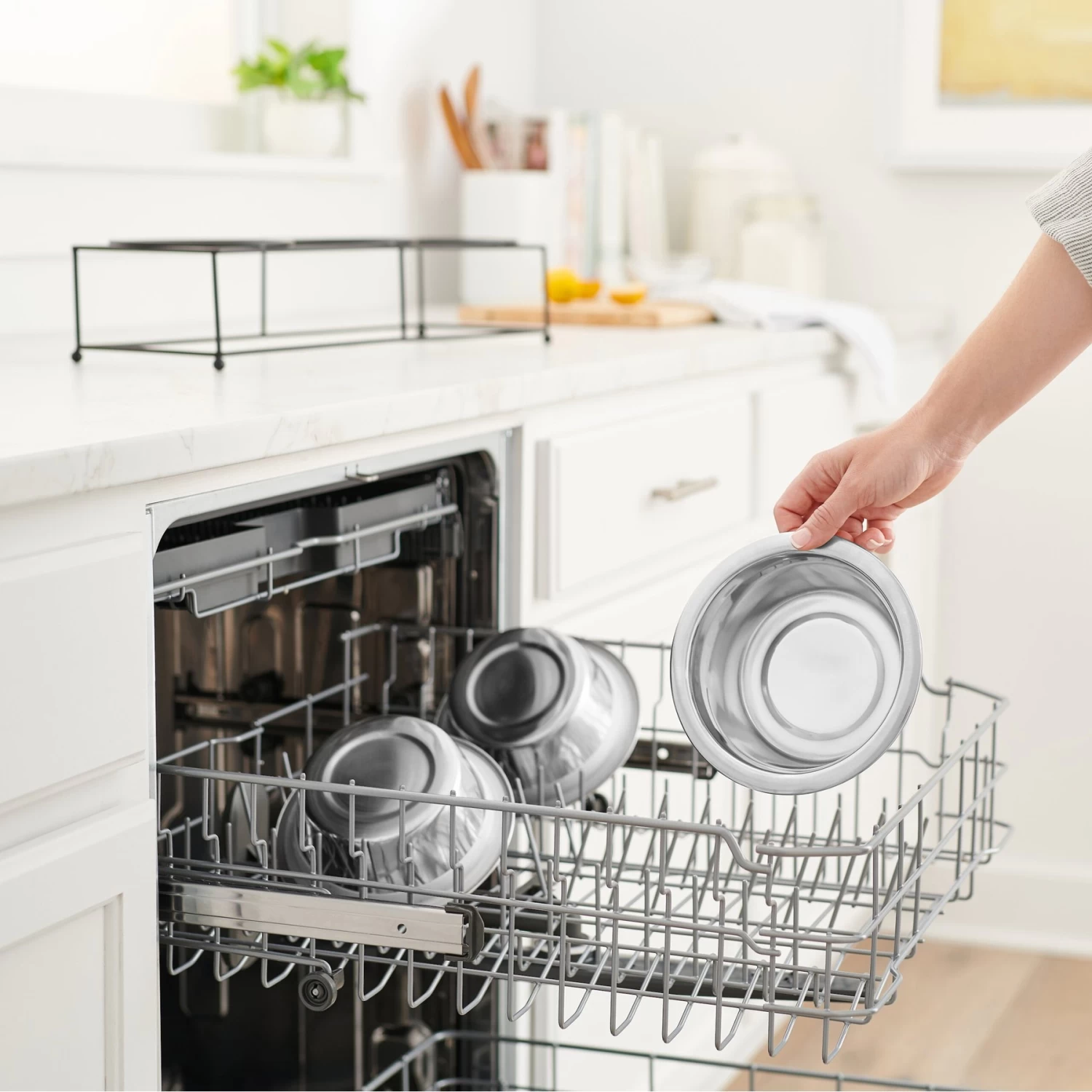 - Care instructions: Removable stainless-steel bowls are hand washable and dishwasher safe.