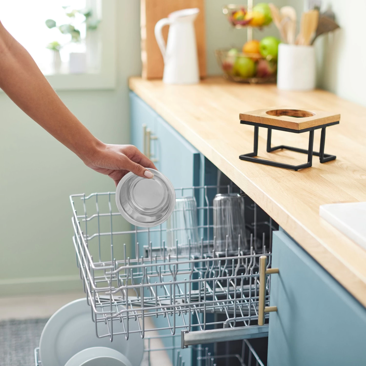- Elevated diner is made from stainless steel with a wooden top, for a sleek and modern look that’ll blend in seamlessly with your home décor.