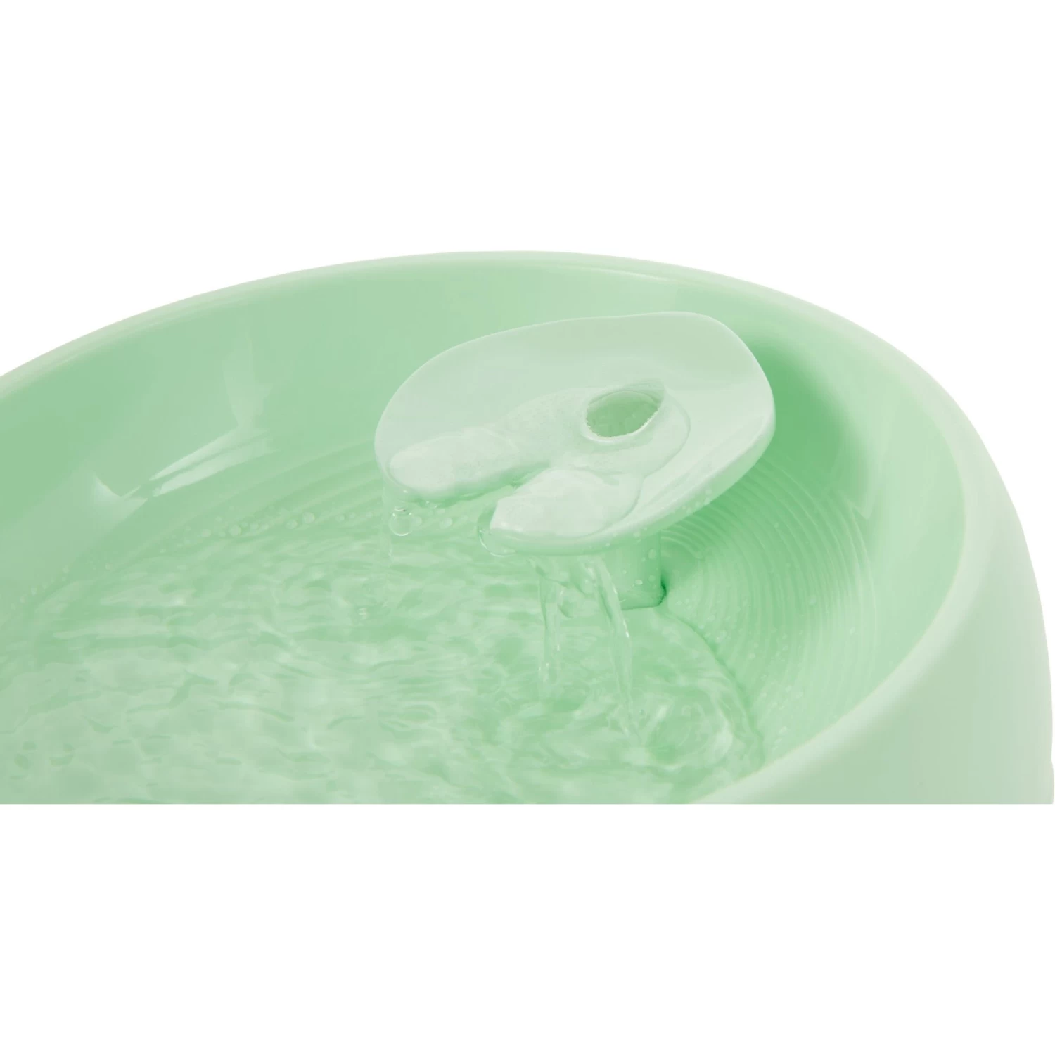 - Whimsical look with a rounded shape, mint green top and a cute lily pad where the water flows from the base into the top reservoir.